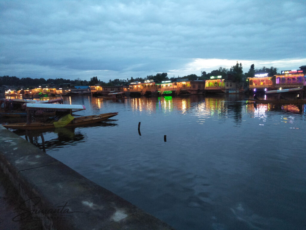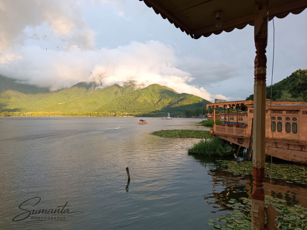 The sight of Dal Lake was mesmerizing. The water stretched out like a giant mirror, reflecting the surrounding mountains and the soft evening sky. Dozens of brightly painted shikaras floated gracefully, each decorated with vibrant cushions and intricate patterns. We boarded one for a leisurely ride, and as the boatman gently rowed us across the calm water, the city’s noise faded into a peaceful silence.